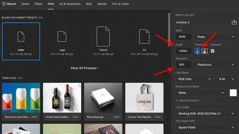 - Quan trọng: Tại ô Resolution, luôn để 300 Pixels/Inch. Nếu để 72 dpi (mặc định web), ấn phẩm in ra sẽ bị mờ nhòe.